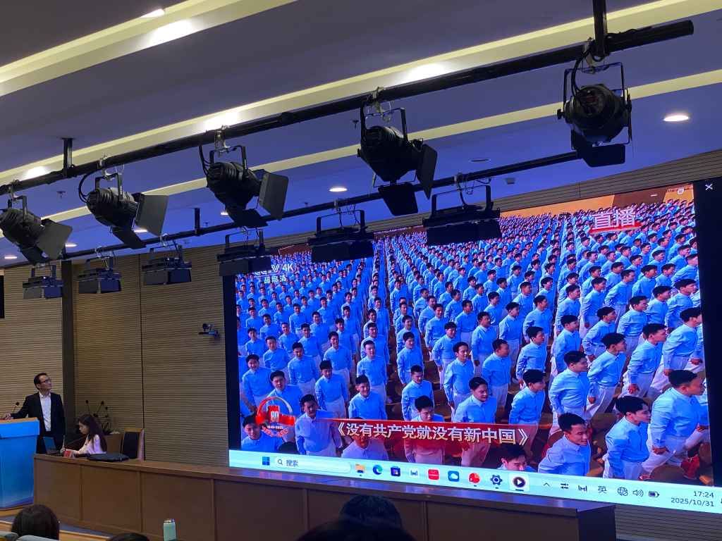 在介绍“国之大典合唱”背后的故事时,李刚教授表示,“天安门广场44万平米,声音传播有延时,8个分指挥要做到抬手高度、呼吸节奏、表情管理完全一致,难度不亚于徒步方队。”他还说道,团队每天挥拍2万次以上,封闭训练时每天练满12小时,女生绑着5斤沙袋练臂力,男生顶着40℃高温站军姿。当听到这些细节时,在场师生都为之动容。